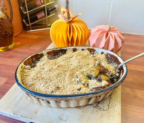 My third recipe for you is my spiced Halloween maple apple crumble. This recipe is oh-so-delicious. Seasonal because of the apples but it is a deliciously spiced, maplely twist on a traditional apple crumble. Perfect for autumn and Halloween night and even better served with plenty of homemade custard. Absolutely scrumptious.