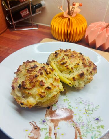Mix all the ingredients together and then refill the potato skins and place on a lined baking tray. Your oven should already be hot but turn it down to 180° C (fan) and bake the potatoes again for twenty minutes until golden brown and bubbling. Be careful as they will be very hot but serve with a lovely side salad for a yummy autumnal dinner.